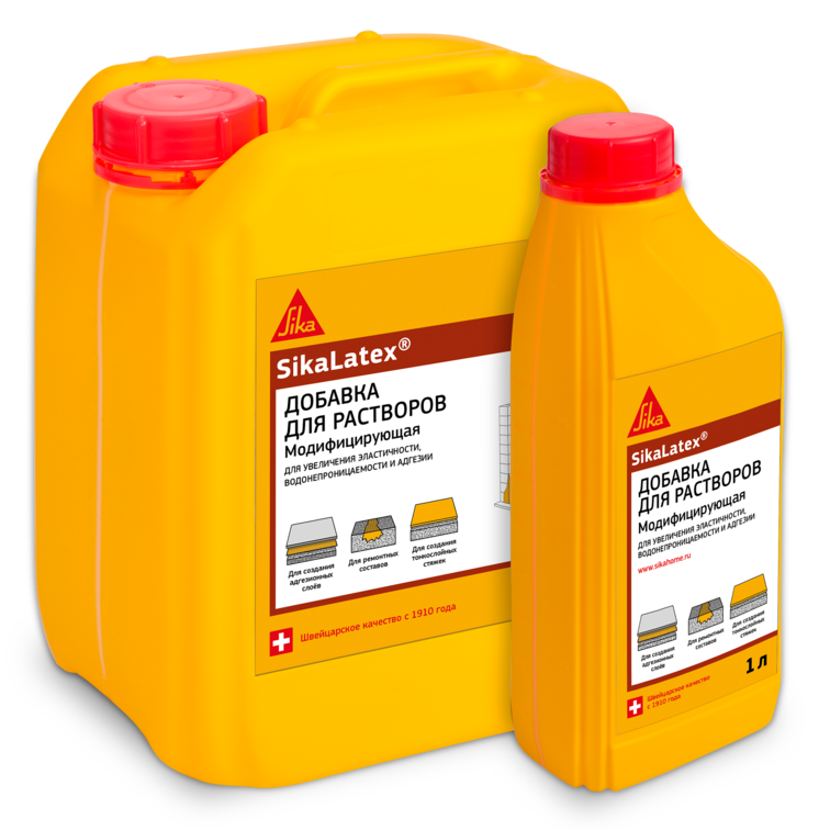 SikaLatex® — модифицирующая добавка на основе эмульсии стирол-акрилового сополимера и бутадиен-стирольного каучука, предназначенная для улучшения адгезии и эксплуатационных характеристик цементных растворов.