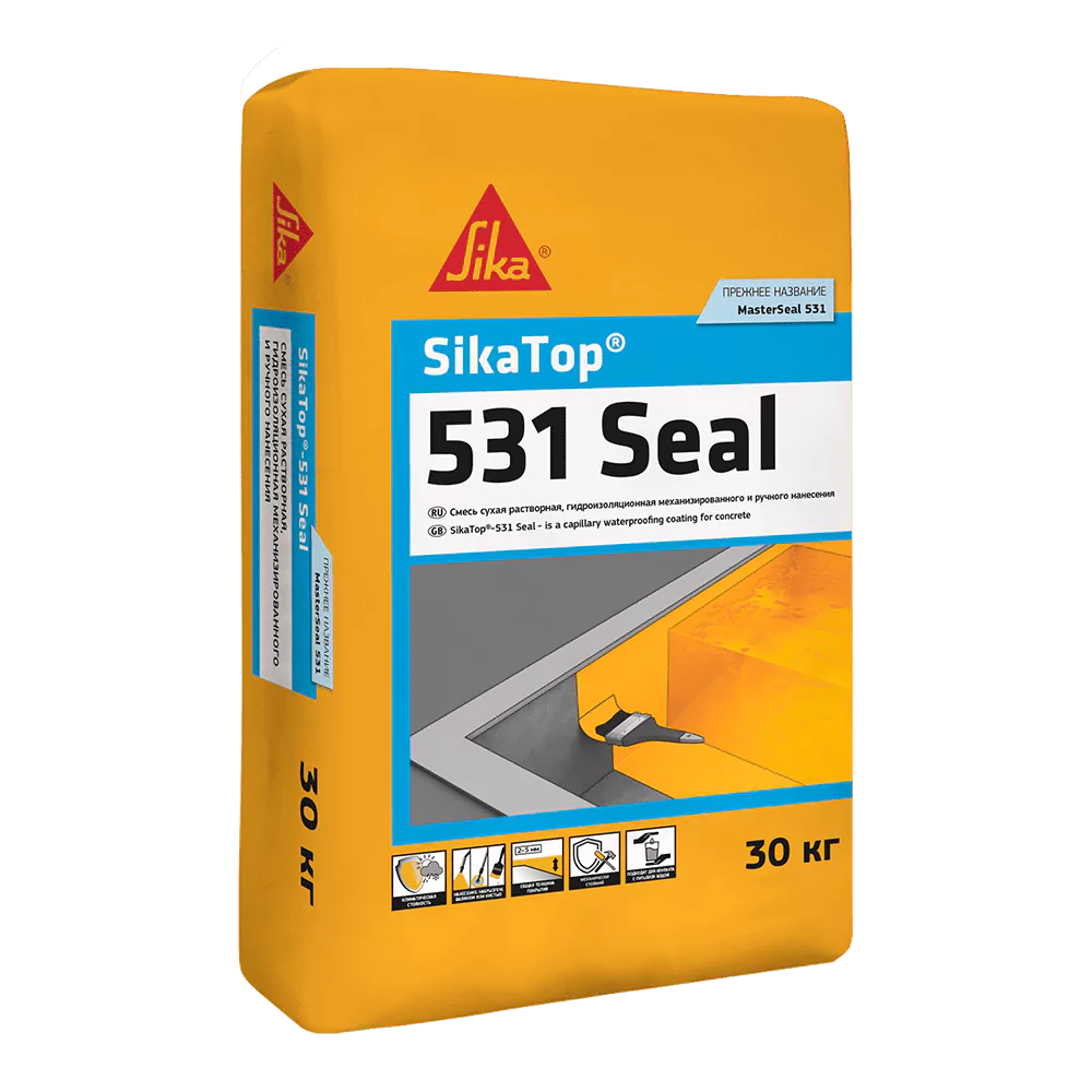 SikaTop®-531 Seal — высококачественное готовое к применению сухое покрытие на цементной основе, содержащее кварцевый песок и комплекс гидрофобных добавок, предназначенное для долговременной обмазочной гидроизоляции бетонных и кирпичных оснований, конструкций, постоянно контактирующих с водой (резервуары, скважины, колодцы).