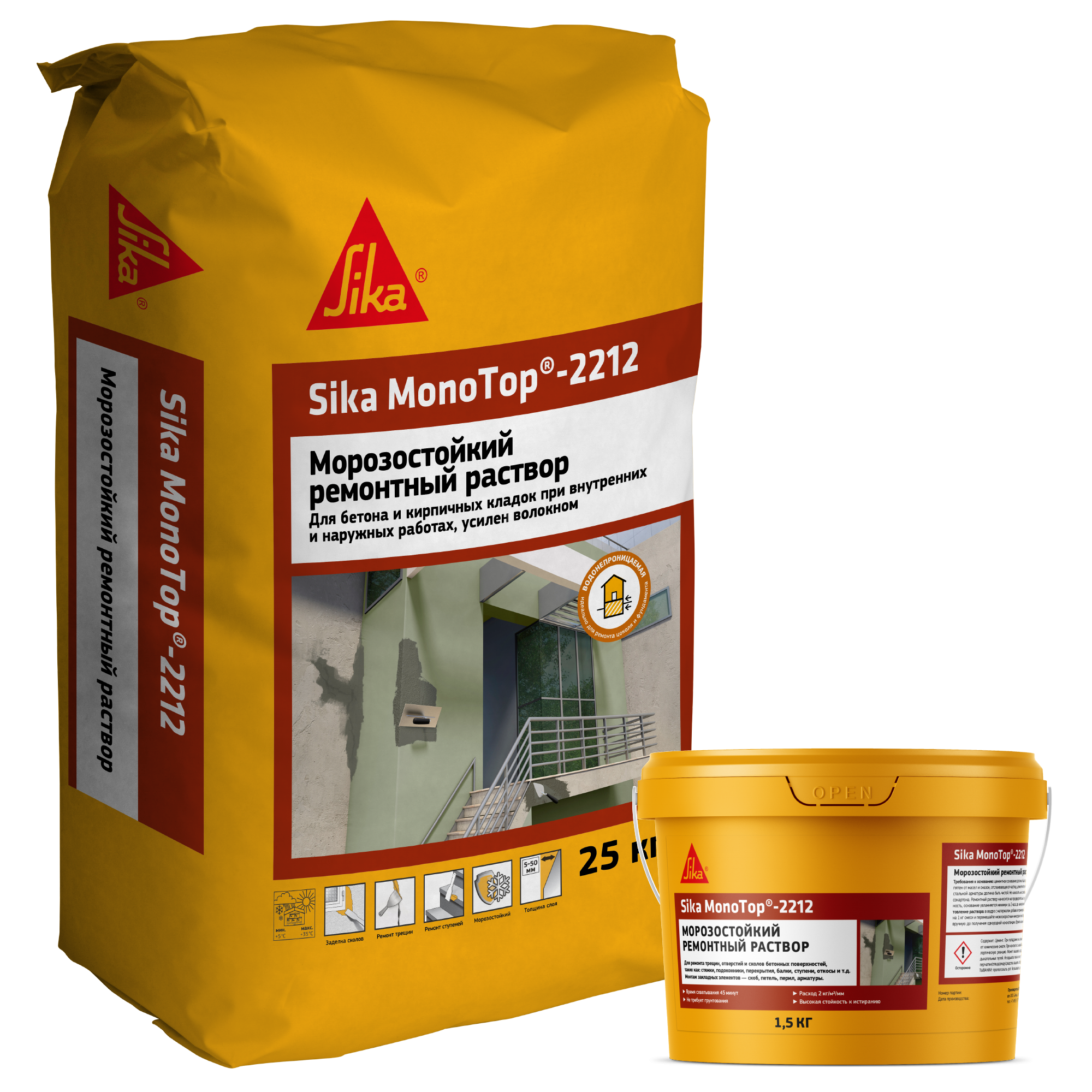 SikaMonoTop®-2212 — универсальная ремонтная смесь тиксотропного типа с компенсированной усадкой и армирующей полимерной фиброй. Предназначена для неконструкционного ремонта бетонных, железобетонных и каменных поверхностей, соответствует классу R2 по ГОСТ Р 56378.