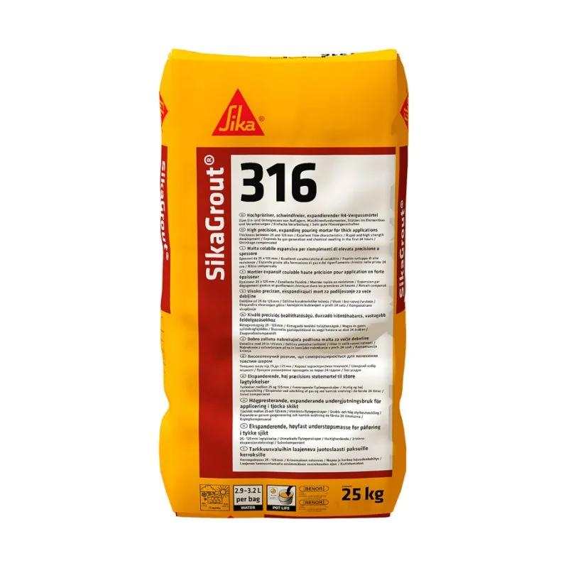 SikaGrout®-316 – быстротвердеющая бетонная смесь наливного типа с компенсированной усадкой, предназначенная для подливки строительных конструкций и оборудования, установки анкеров, а также конструкционного ремонта бетонных и железобетонных конструкций. Ремонтная смесь класса R4 по ГОСТ Р 56378 (EN 1504-3).